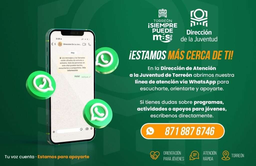 La Dirección de la Juventud de Torreón informa a la ciudadanía sobre la puesta en marcha de una nueva línea de atención a través de