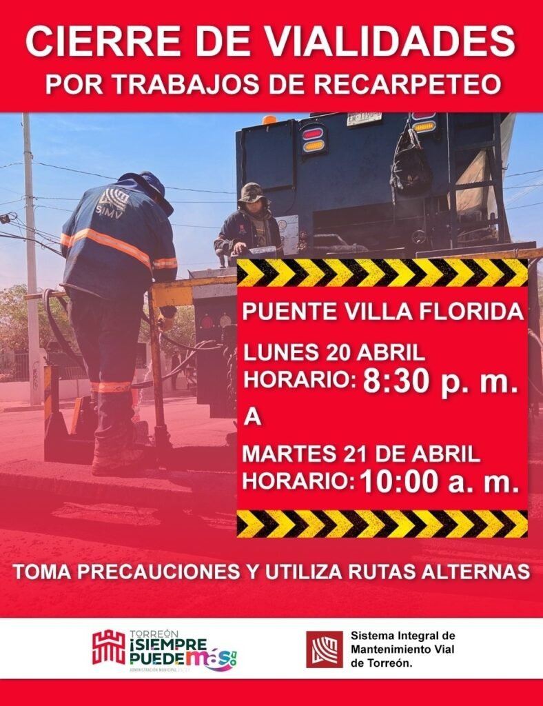 Torreón, Coahuila, a 19 de abril de 2026. – El Sistema Integral de Mantenimiento Vial (SIMV) del Municipio de Torreón, informa sobre el reporte oficial