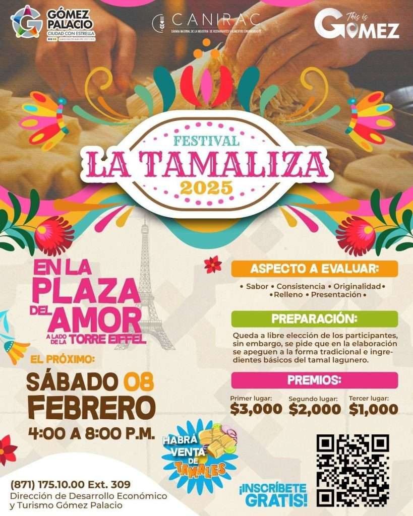 El Ayuntamiento de Gómez Palacio, a través de la Dirección de Desarrollo Económico y Turismo, invita a los emprendedores del giro gastronómico a participar en el “Festival la Tamaliza 2025”.